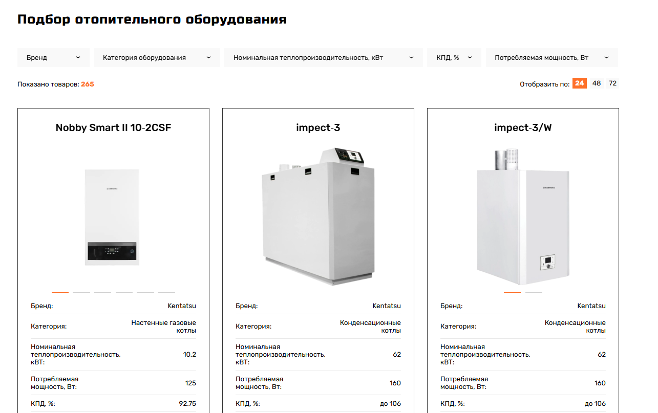 Каталог с разделами по типам котлов и блоком характеристик позволяет легко ориентироваться и быстро находить нужное оборудование.